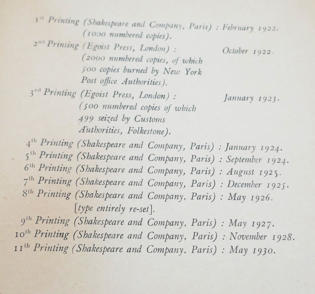 Between 1922 and 1925 the text of Ulysses was reprinted six times. In May 1926 Shakespeare & Company issued a second edition in which the type was entirely reset and Joyce’s corrections from the previous printings were absorbed.