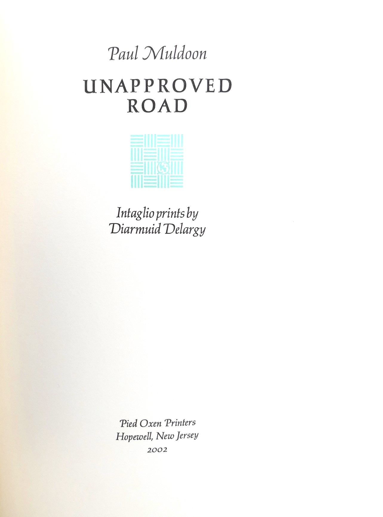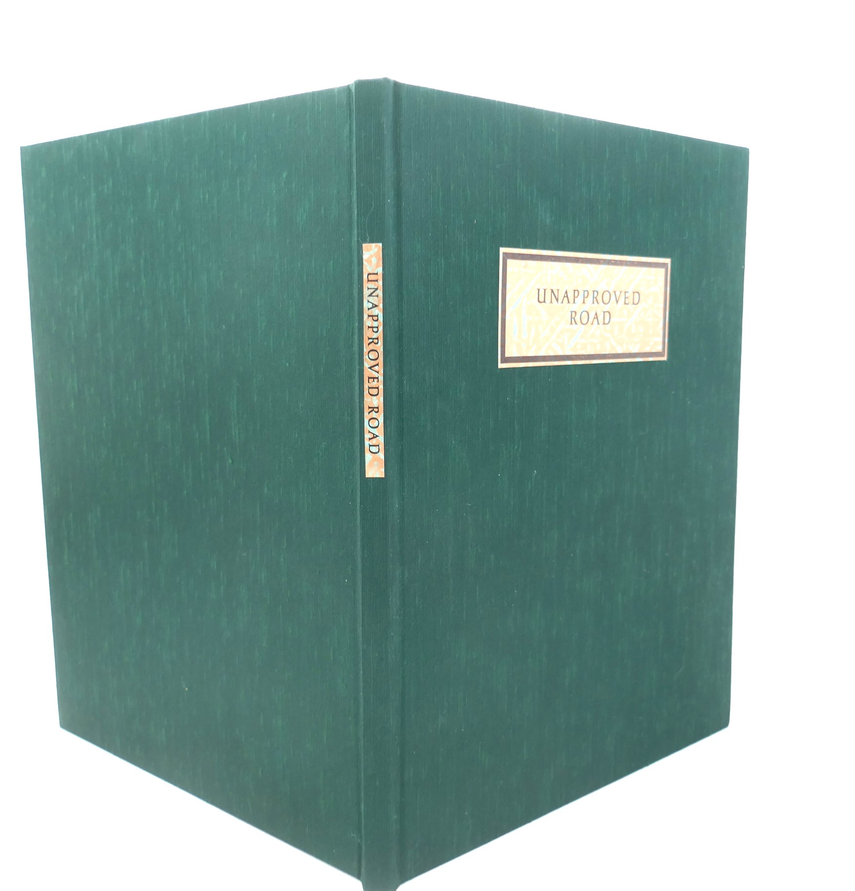 Unapproved Road. Intaglio prints by Diarmuid Delargy. New Jersey: Pied Oxen Printers, 2002. First Edition, Limited Issue. Bound in original green Asahi cloth, printed paper labels on spine and upper cover, printed on Somerset Book Wove soft white, the prints on Somerset Textured. A fine bright copy.