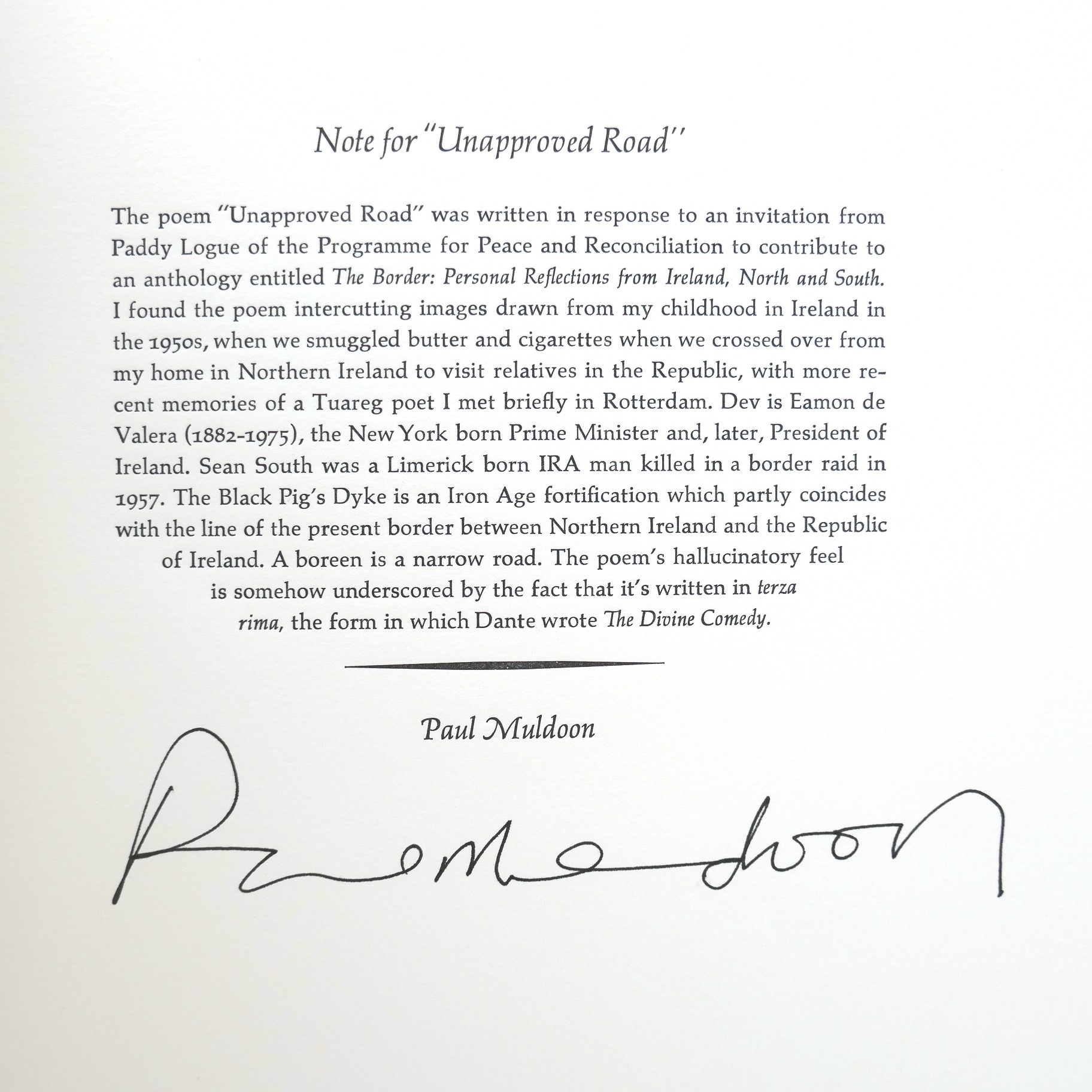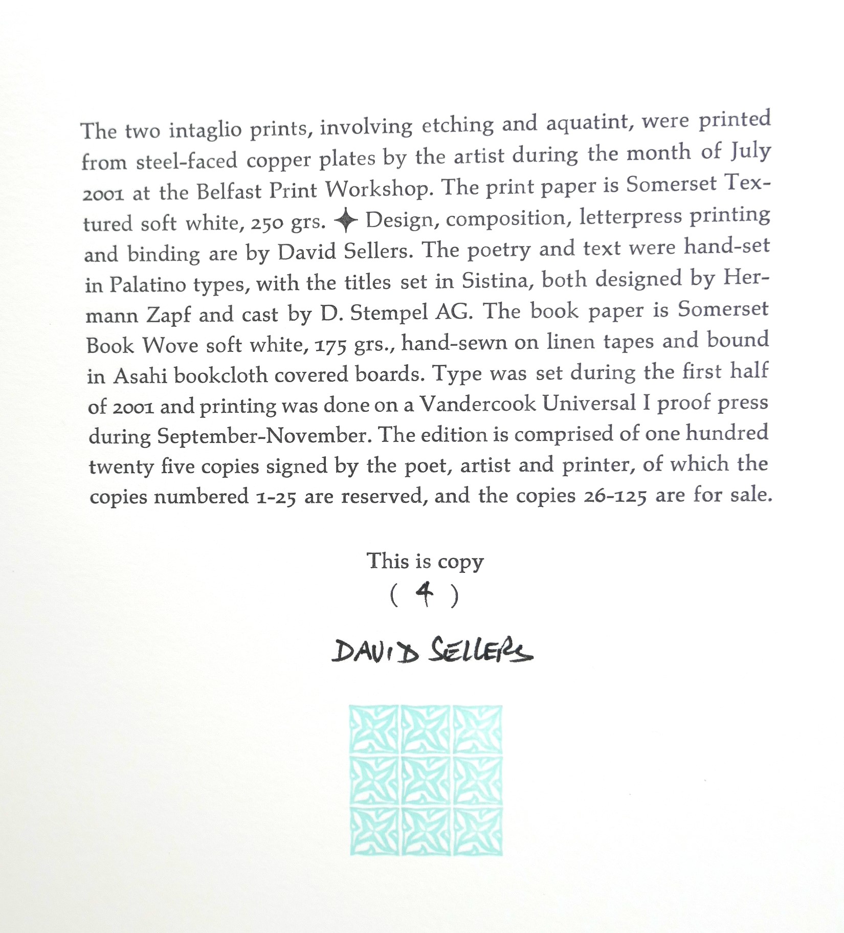 Limited Edition of 125 Numbered Copies. Signed by Paul Muldoon on the half title page and Diarmuid Delargy on the intaglio plates and the printer David Sellers on the limitation page.