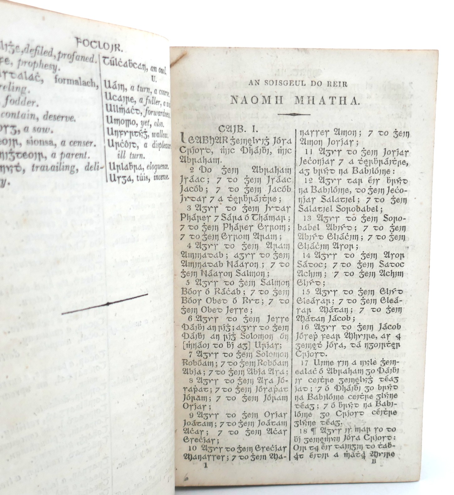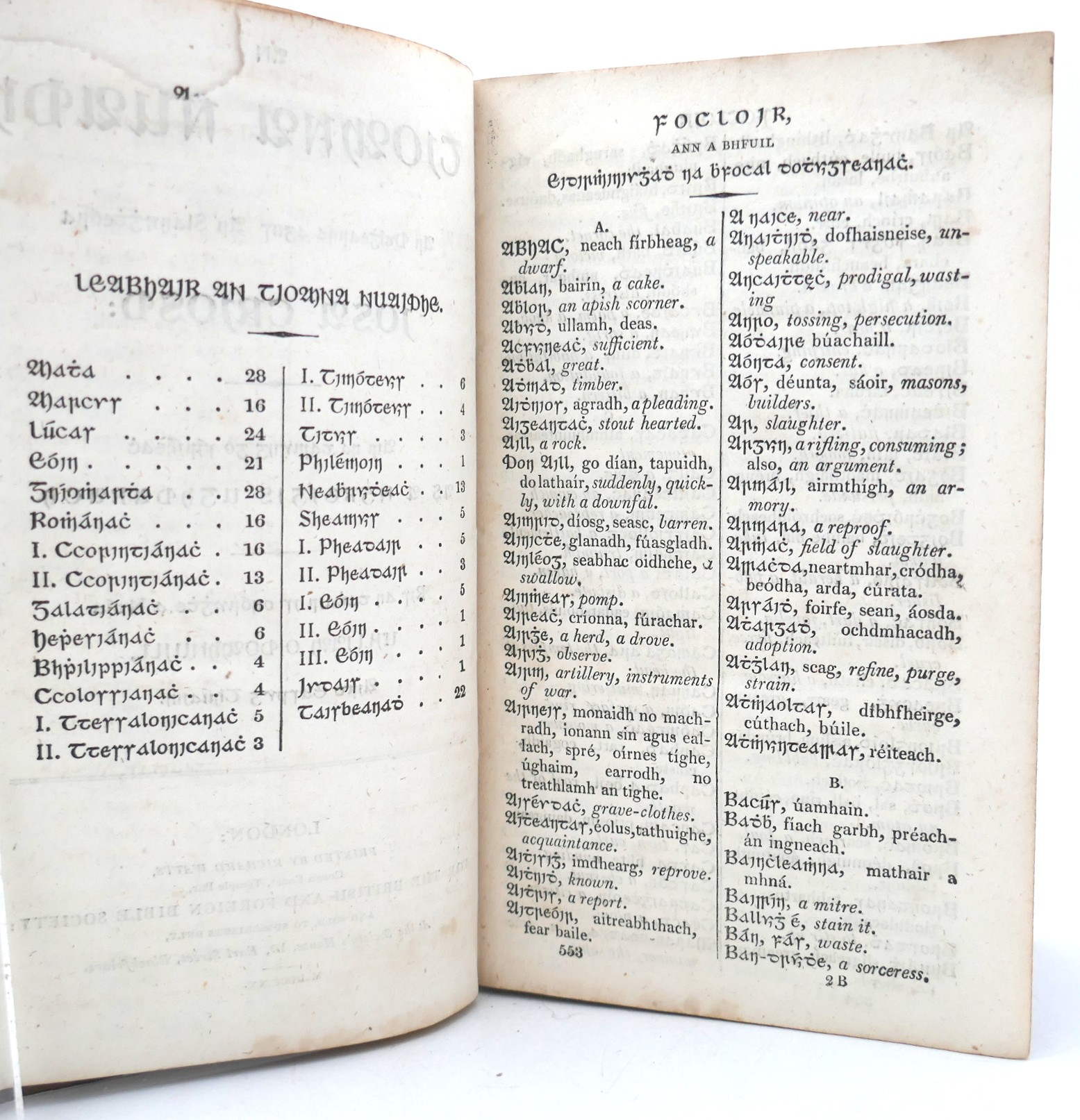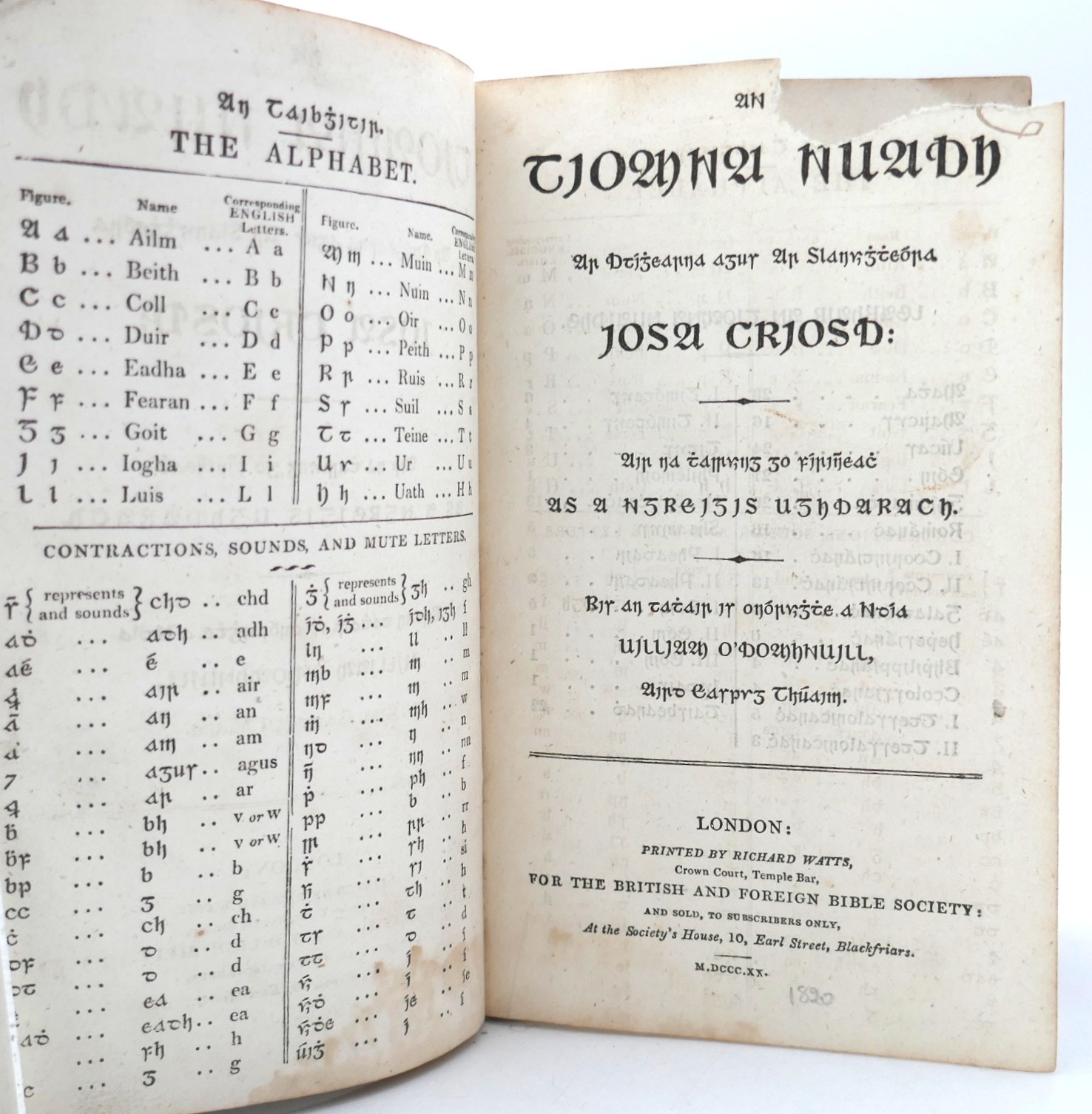 An Tiomna Nuadh. Ar dTíghearna agus ar Slánuightheora Iosa Criosd. Air na thamriing go firinneac as a ngreigis ughdarach. Ris an tathair is onóruighthe a nDia Uilliam O’Domnuill, Aird Easpug Thúaim. London: Printed by R. Watts for the British and Foreign Bible Society, 1820. Pp. (4), [10]-562. Small 8vo.