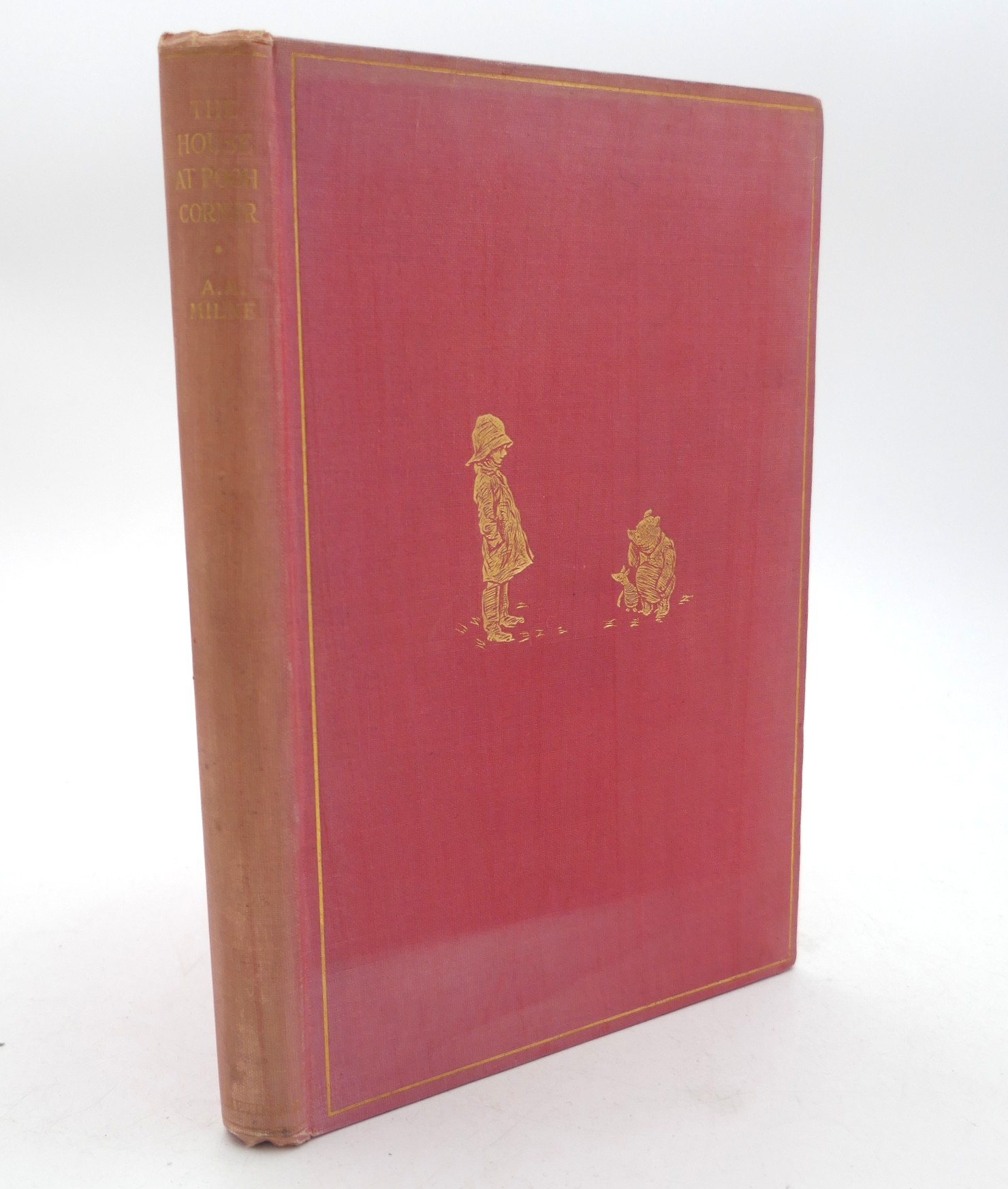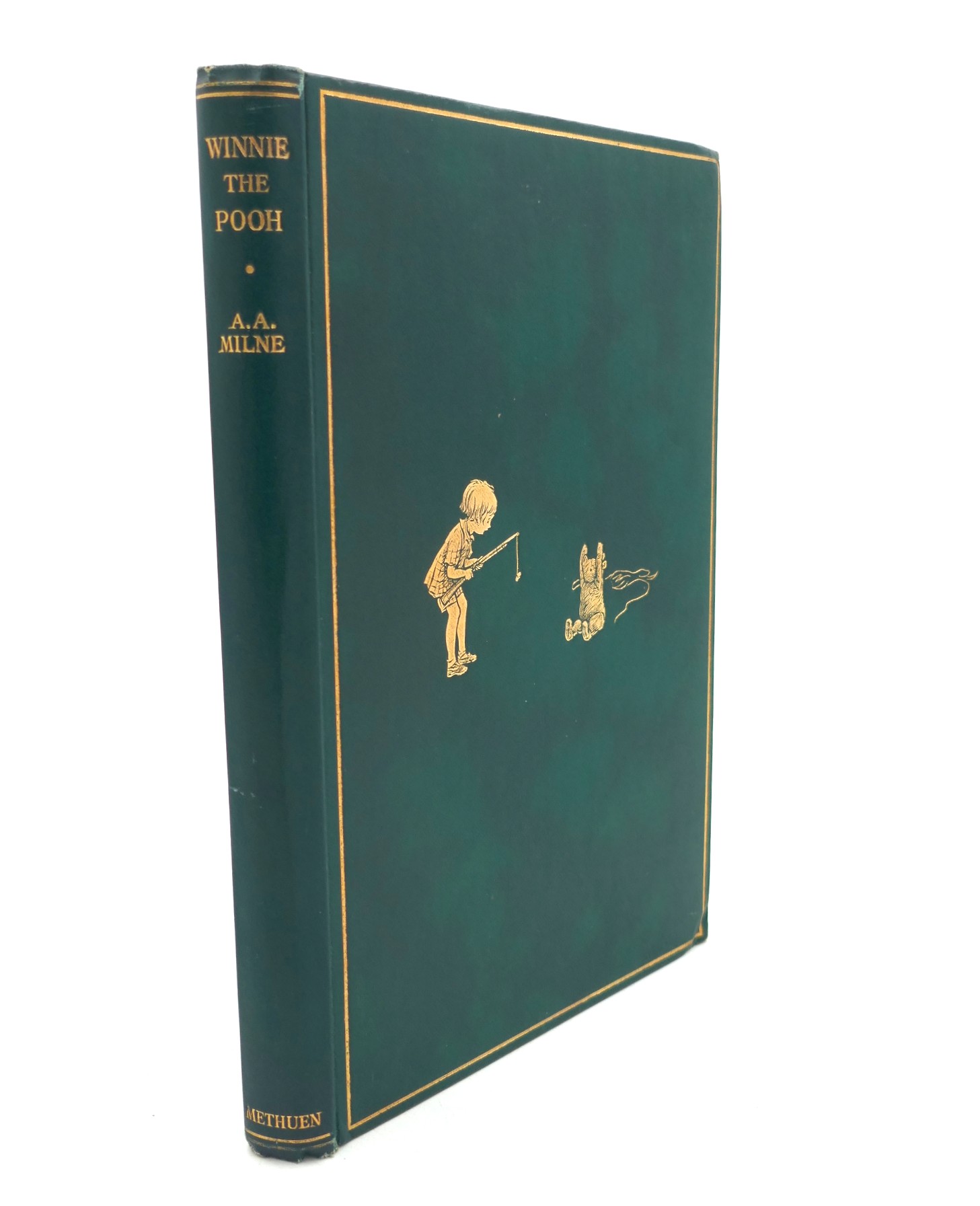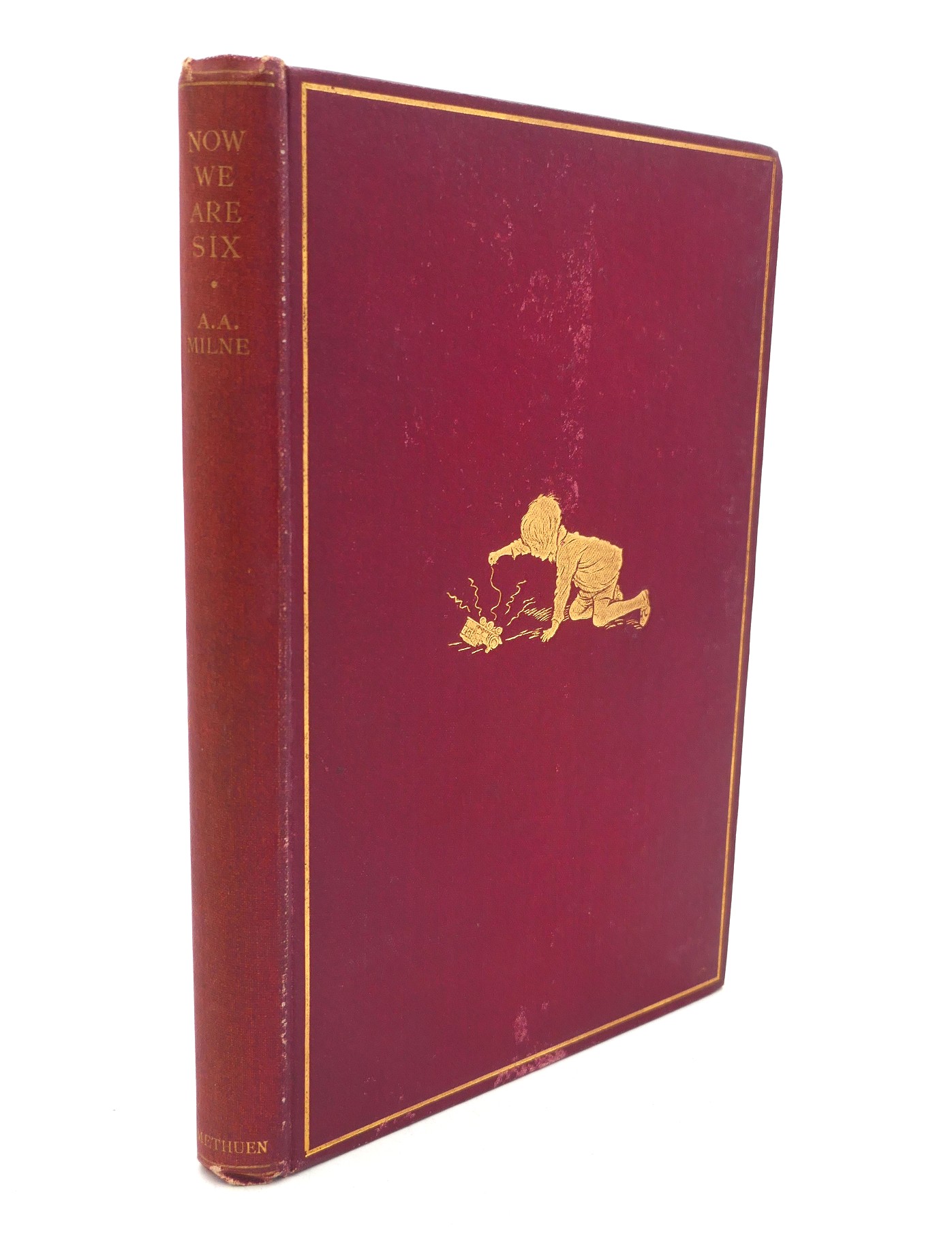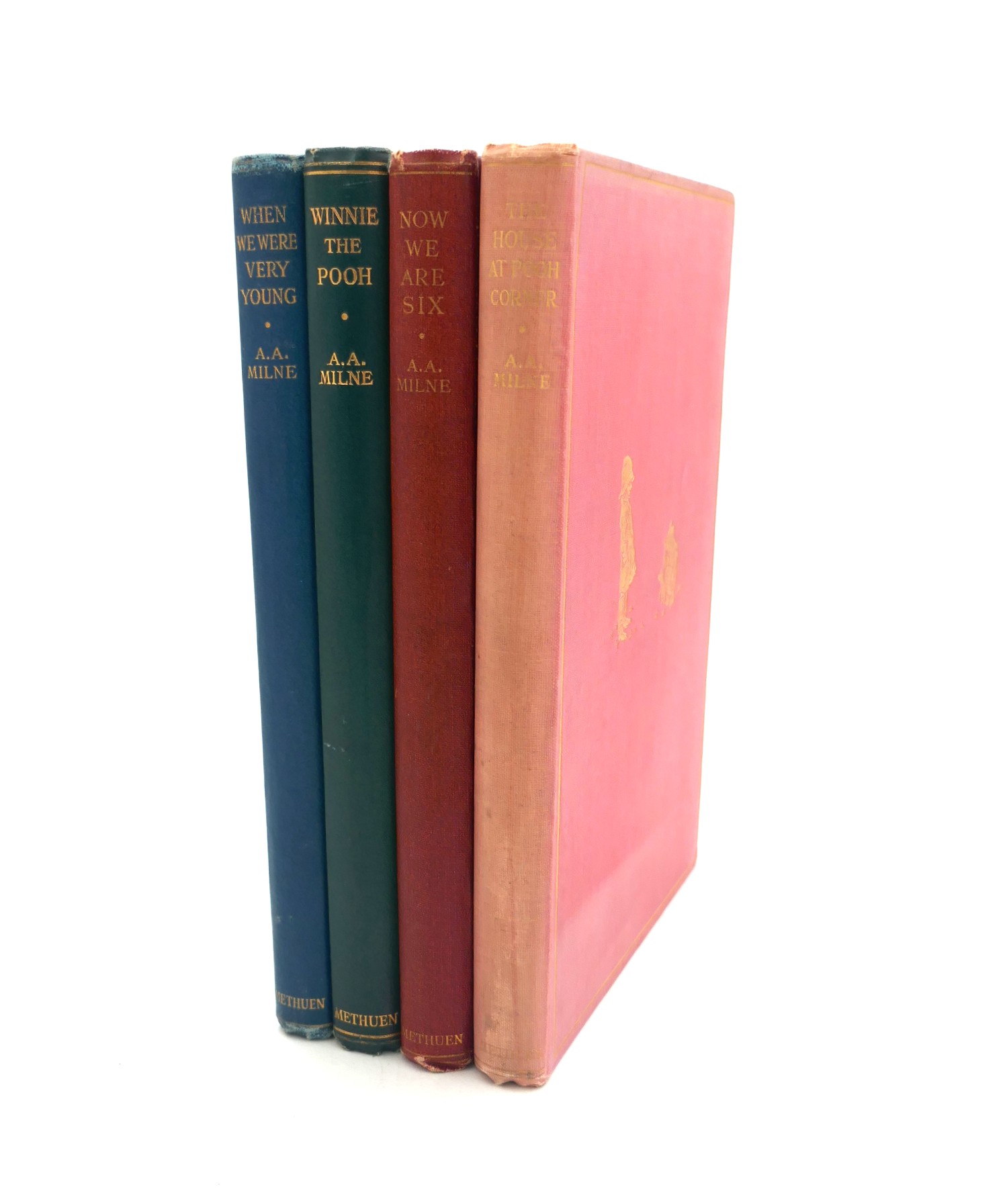 When We Were Very Young. First Edition, First Issue,1924 ; Winnie The Pooh. First Edition, 1926; Now We Are Six. First Edition, 1927; The House At Pooh Corner. First Edition 1928. Four volumes. Illustrated by E.H. Shepard. London: Methuen & Co.,, (1924 – 1928). All four volumes are in publisher’s original cloth (royal blue, dark green, maroon and pink) and stamped in gilt, with top edges gilt, lacking the dust jackets. A nice bright set.