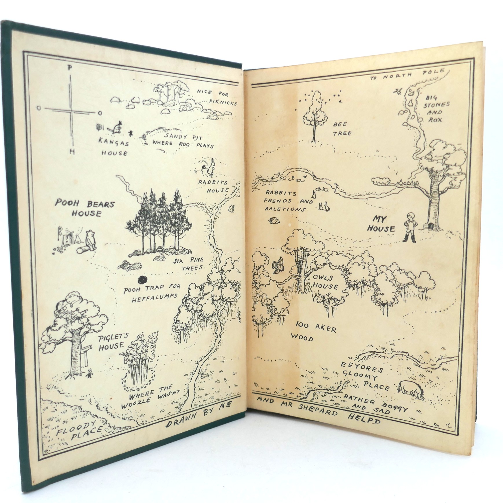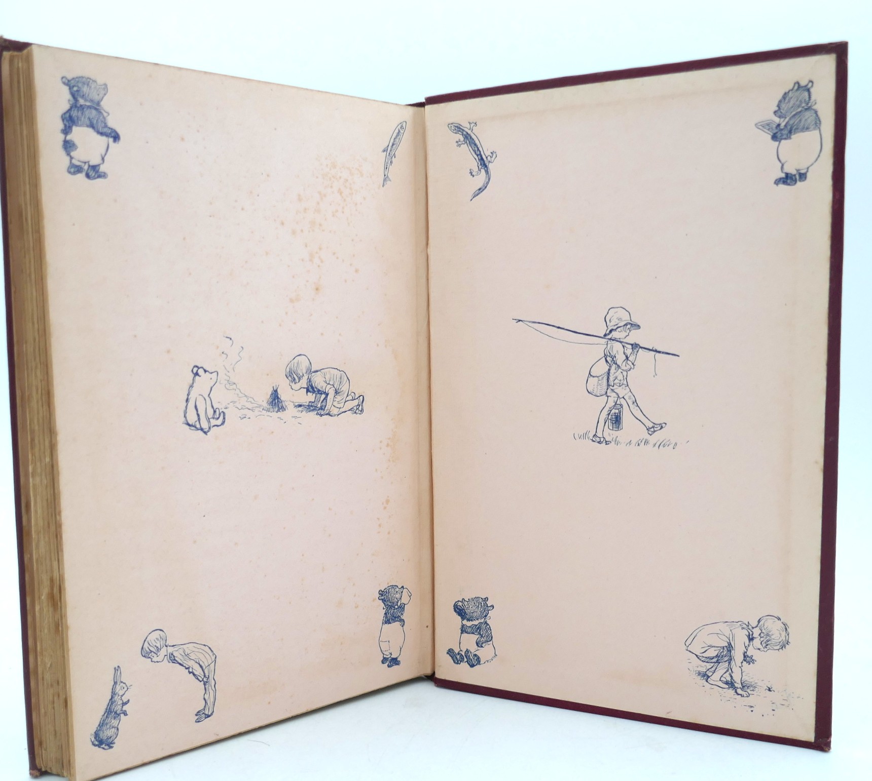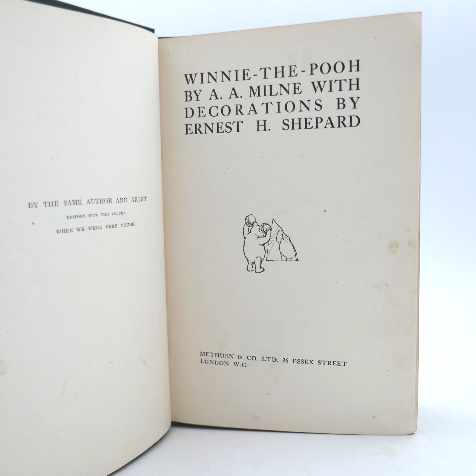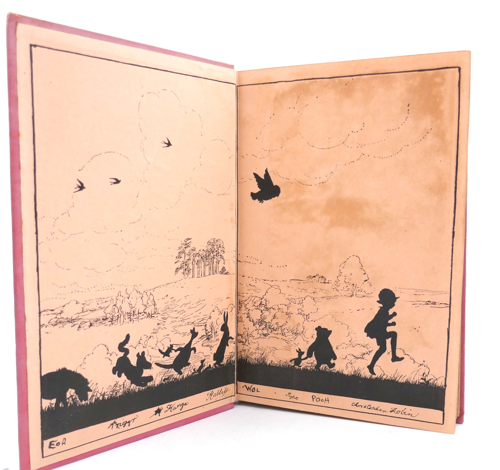 When We Were Very Young. First Edition, First Issue,1924 ; Winnie The Pooh. First Edition, 1926; Now We Are Six. First Edition, 1927; The House At Pooh Corner. First Edition 1928. Four volumes. Illustrated by E.H. Shepard. London: Methuen & Co.,, (1924 – 1928). All four volumes are in publisher’s original cloth (royal blue, dark green, maroon and pink) and stamped in gilt, with top edges gilt, lacking the dust jackets. A nice bright set.