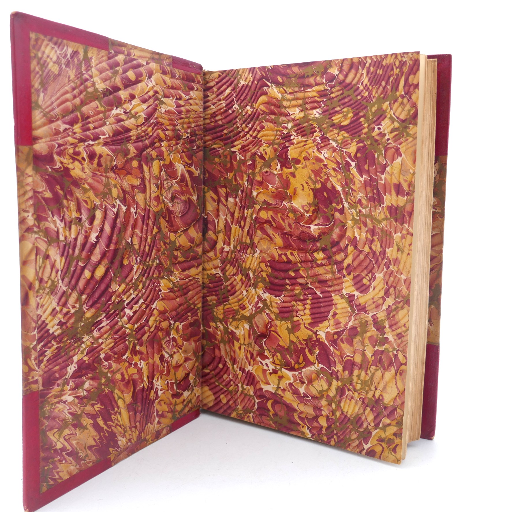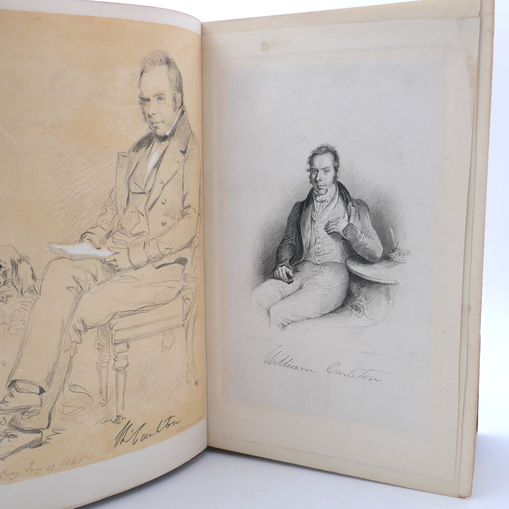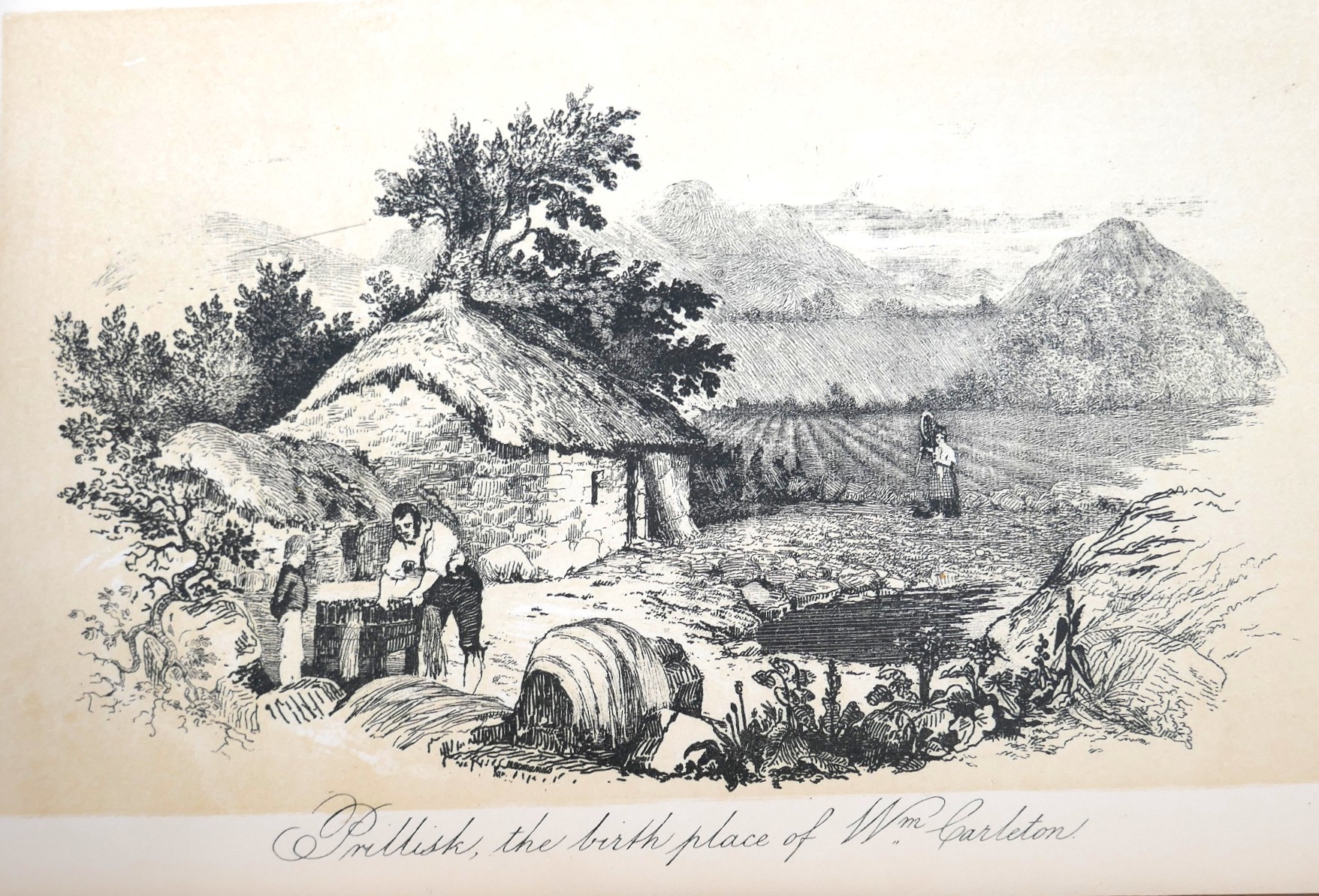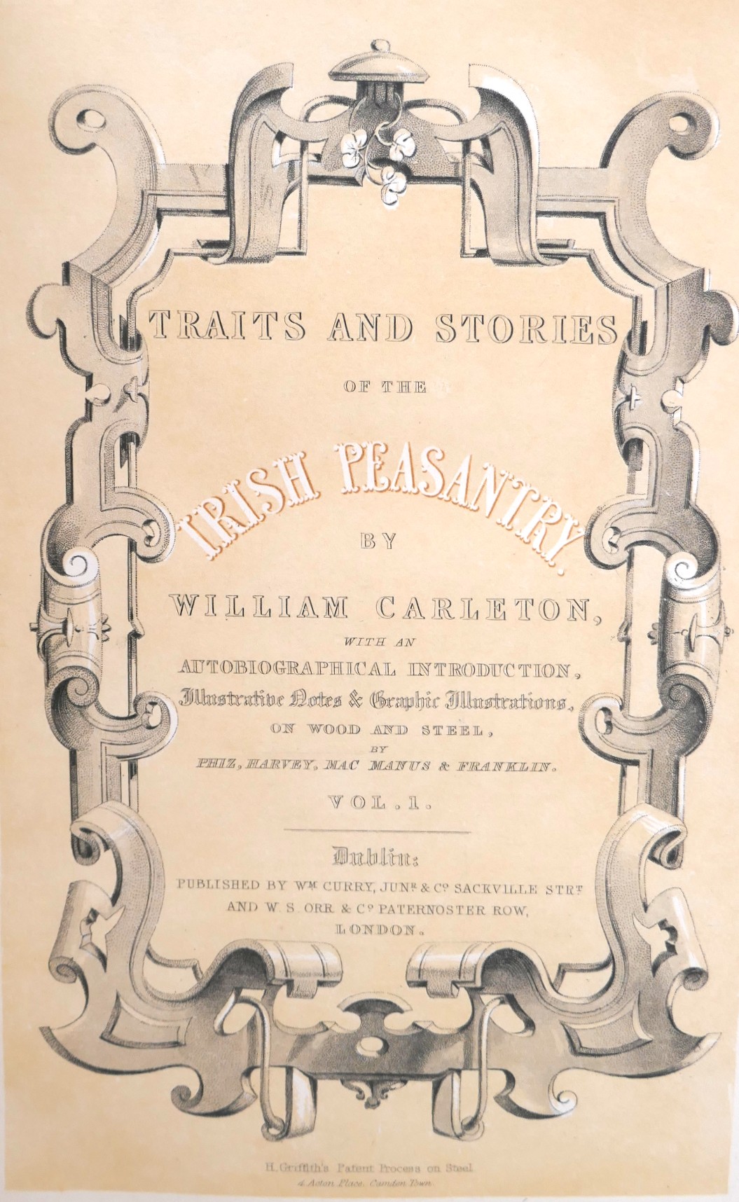 Traits and Stories of the Irish Peasantry. A New Edition With An Introduction, Explanatory Notes and Numerous Illustrations by Harvey, Gilbert, Phiz, Franklin MacManus and other Artists of Excellence. Two Volumes. Dublin: William Curry, 1843. Pp (1) xxiv, 426; (2) 430. Original crimson half morocco over marbled boards, spine compartments lettered in gilt, top edges in gilt. Light scuffing along inner hinge of volume one, otherwise a nice bright set, in a fine binding.